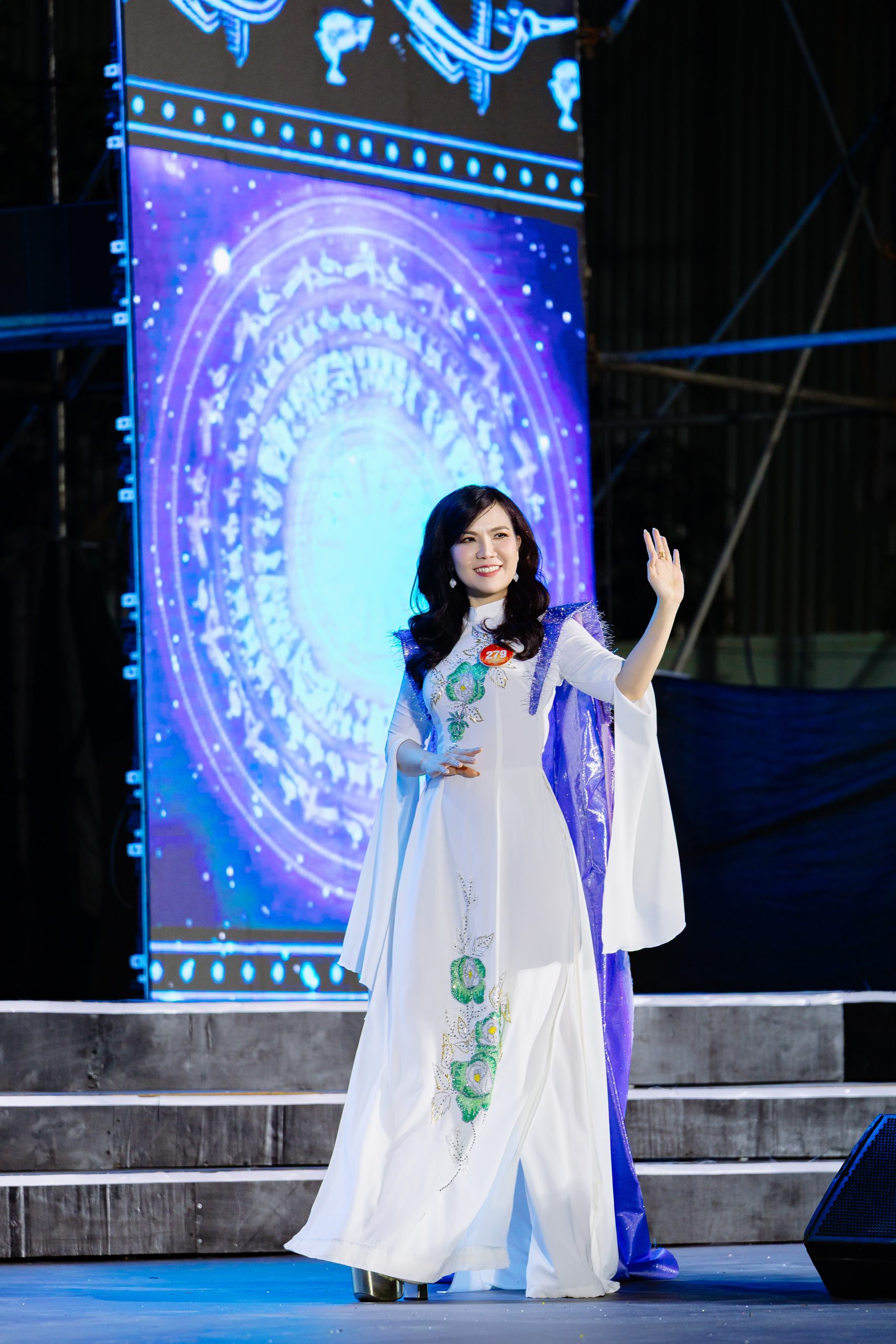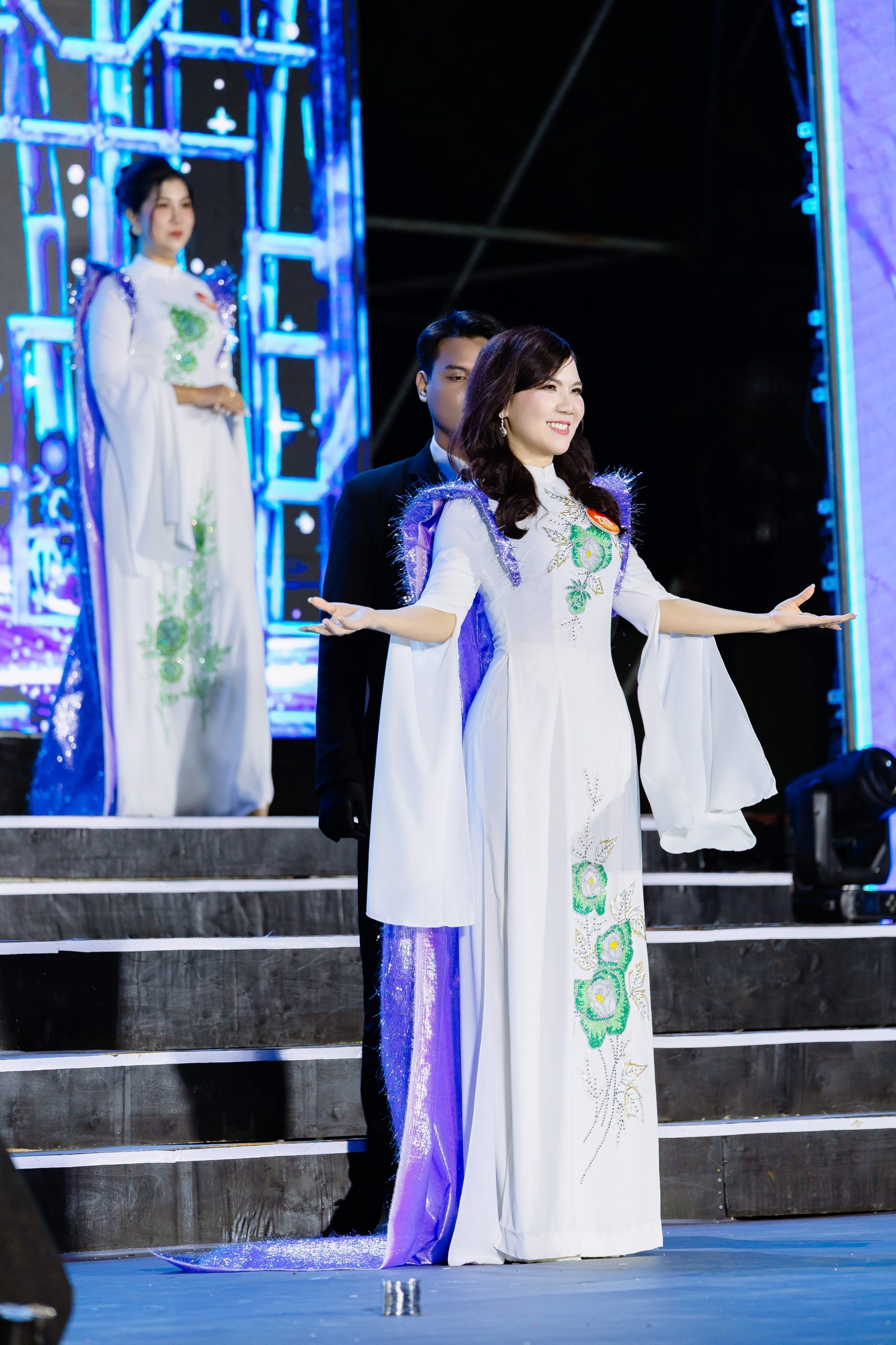 Tiếp theo phần thi trang phục áo dài, các thí sinh duyên dáng sải bước trong BST “Quý cô phố núi” của NTK Tony Phạm. Trên nền lụa trắng tinh khôi, phom áo dài truyền thống được tôn dáng bằng những họa tiết hoa hồng đính đá thủ công với sắc đỏ, cam, vàng, xanh,.. như những đóa hoa xuân bung nở giữa cao nguyên. Đường thêu tinh xảo kết hợp ánh pha lê tạo hiệu ứng lấp lánh. Điểm nhấn mềm mại là áo choàng voan lụa xanh lam đính sợi ánh kim, khắc họa hình ảnh quý cô doanh nhân thanh lịch, đậm nét truyền thống.