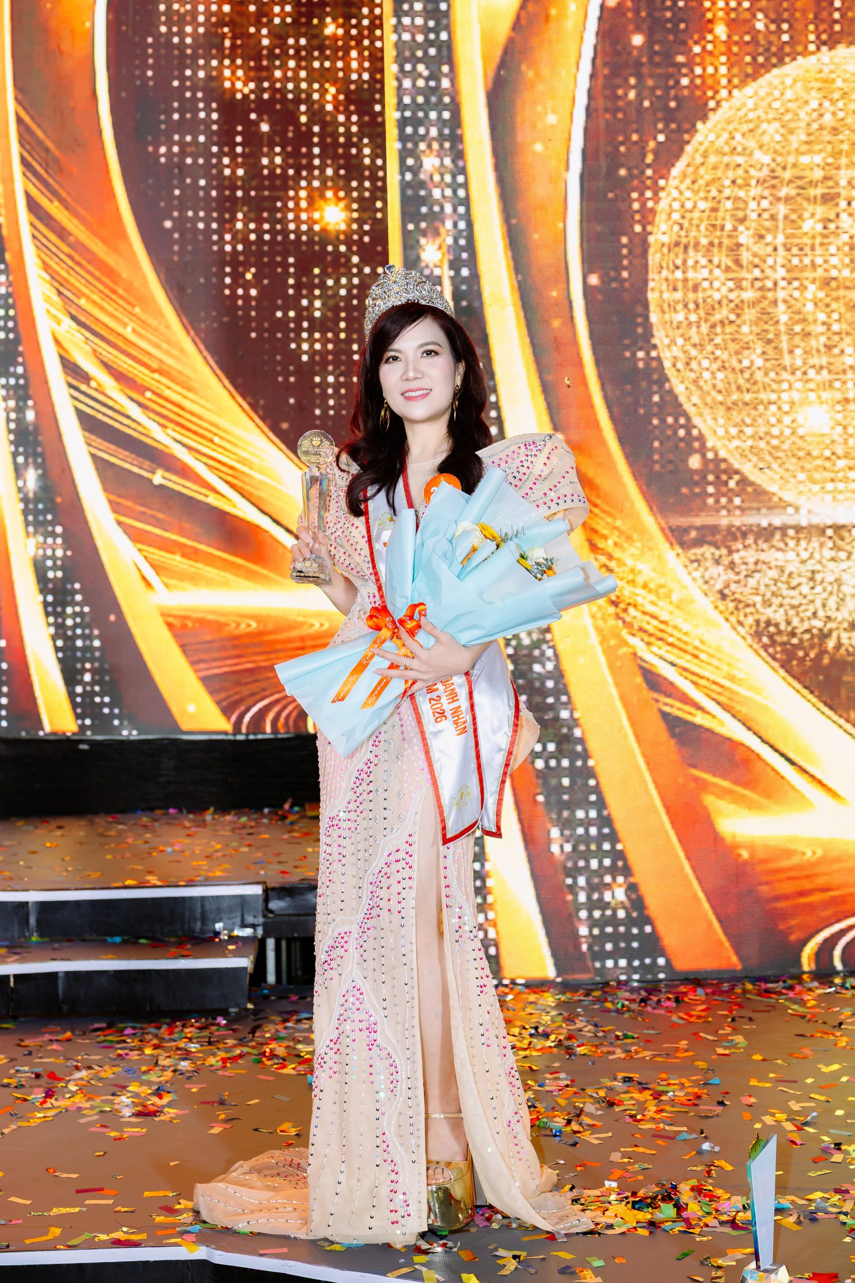 Trong giây phút trang trọng của đêm chung kết, nữ doanh nhân Kiều Ngọc Hạnh không giấu được niềm xúc động khi đón nhận tiara, sash danh hiệu, cúp lưu niệm cùng bằng chứng nhận dành cho danh vị Á hậu 3 – Hoa hậu Doanh nhân Việt Nam 2026.