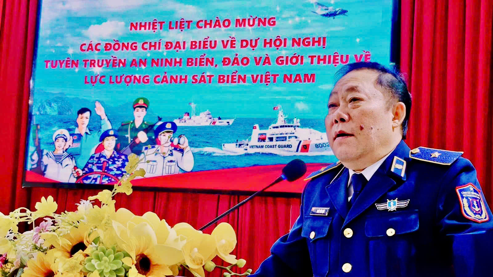 Thiếu tướng Trần Văn Hậu, Bí thư Đảng ủy, Chính ủy Bộ Tư lệnh Vùng Cảnh sát biển 1, phát biểu tại hội nghị tuyên truyền pháp luật về biển, đảo tại xã Minh Châu, Nghệ An