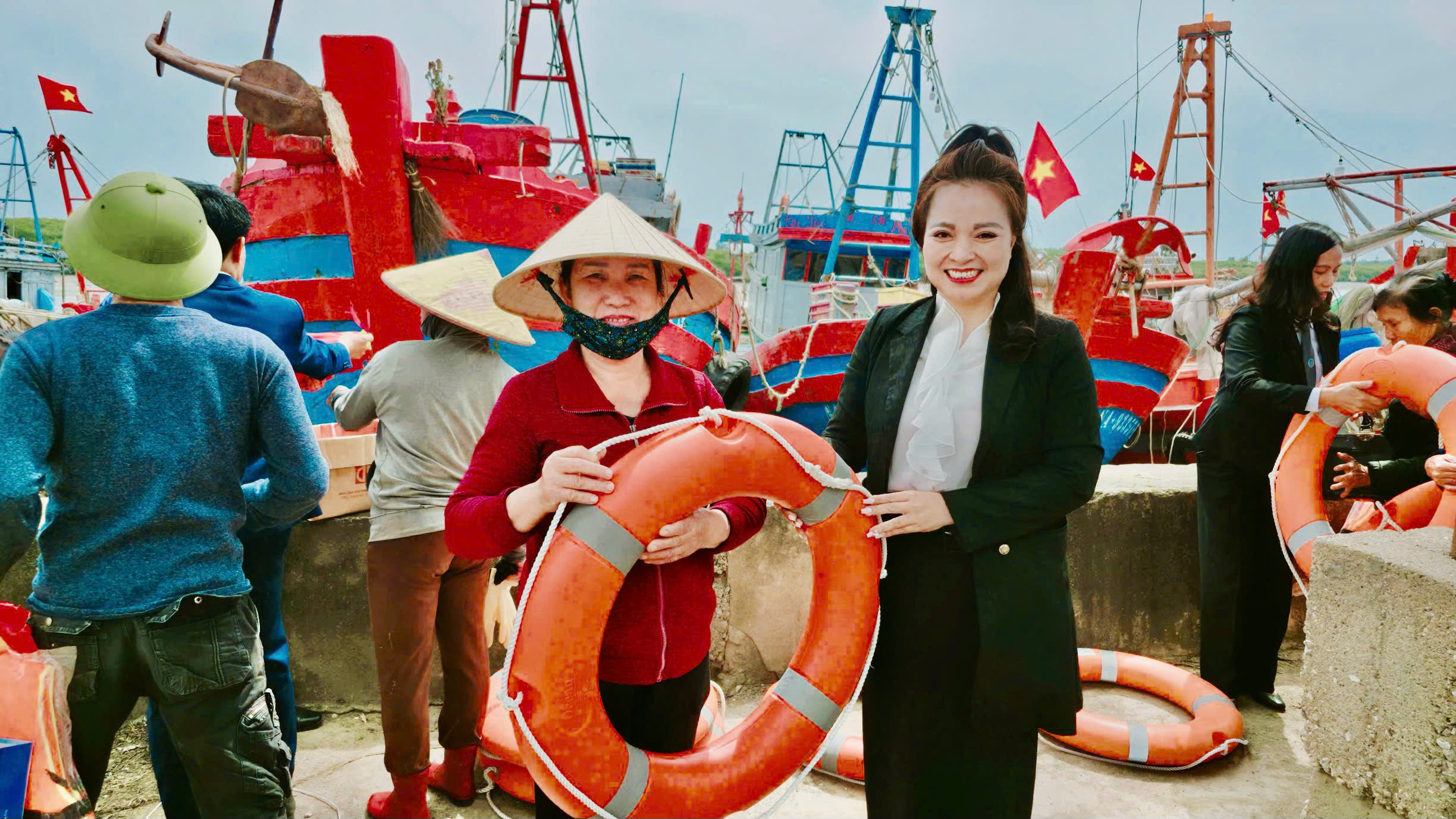 Hoa hậu Nhân ái Hoàng Ngân cùng các đại biểu gặp gỡ, tuyên truyền phát tờ rơi, sổ tay pháp luật, trao cờ Tổ quốc và tặng quà, động viên bà con ngư dân yên tâm vươn khơi bám biển tại cảng cá Lạch Vạn