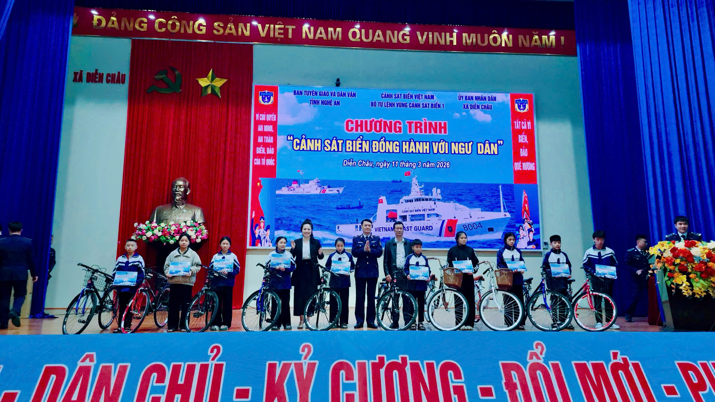 Cũng trong ngày 11/3, Ban Tổ chức đã trao nhiều phần quà cho các gia đình ngư dân có hoàn cảnh khó khăn; tặng 20 xe đạp cho học sinh nghèo vượt khó và 1 ti vi cho UBND xã Diễn Châu phục vụ công tác tuyên truyền tại địa phương.