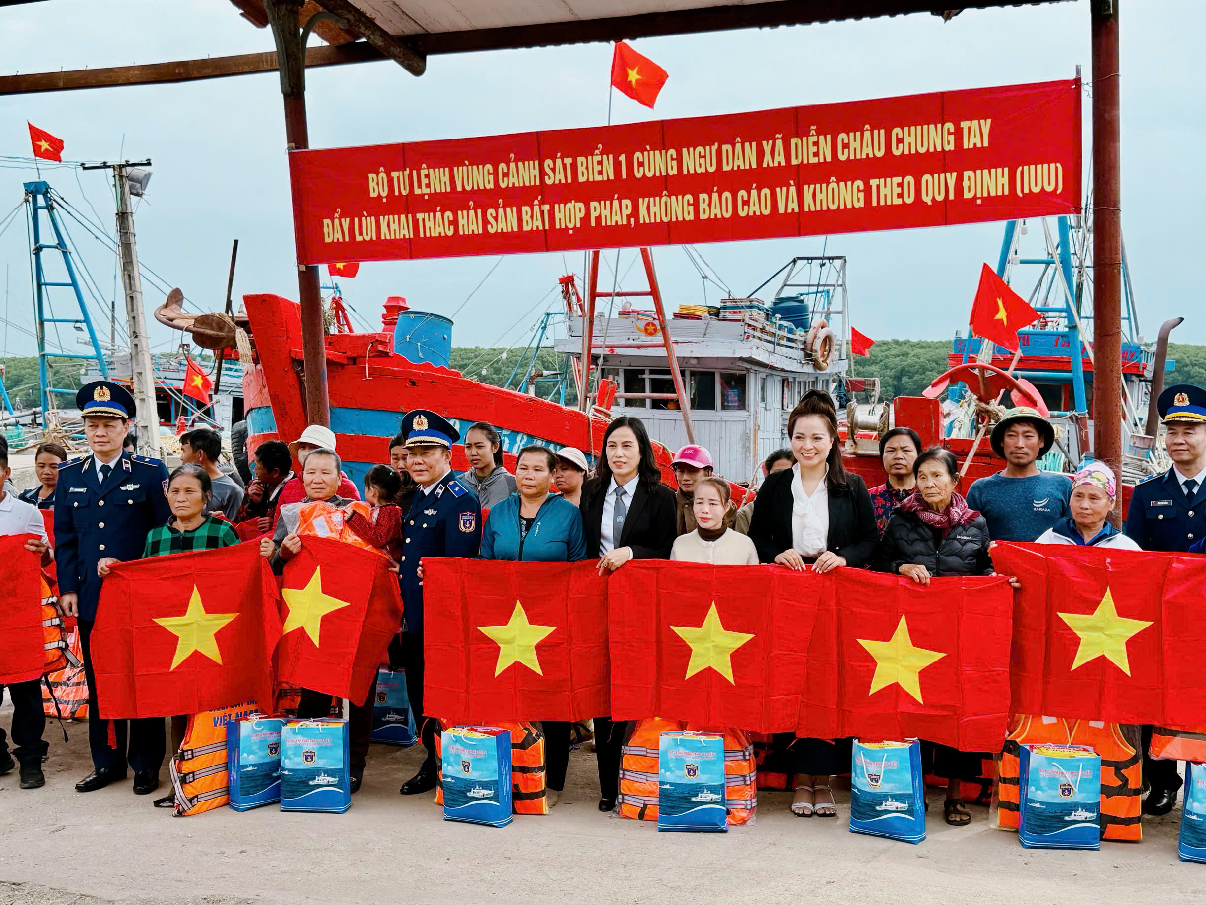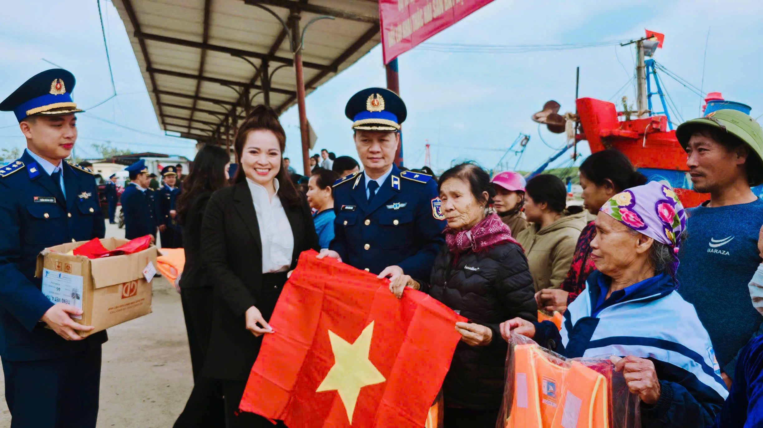 Tại cảng cá Lạch Vạn, Hoa hậu Nhân ái Ngô Thị Hoàng Ngân cùng cán bộ, chiến sĩ Cảnh sát biển trực tiếp gặp gỡ, thăm hỏi ngư dân; phát hàng trăm tờ rơi, sổ tay pháp luật, trao cờ Tổ quốc, áo phao, phao tròn và 22 suất quà, động viên bà con yên tâm vươn khơi bám biển. Hình ảnh những lá cờ đỏ sao vàng được trao tận tay ngư dân giữa nhịp sống lao động nơi cửa biển như một biểu tượng đẹp: mỗi con tàu ra khơi là một “cột mốc sống”, mỗi ngư dân bám biển là một người lính nơi tuyến đầu chủ quyền trong thời bình.